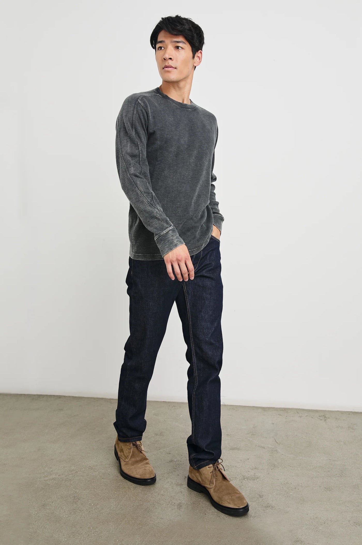 Rheese is the perfect lightweight layer. It's cut from ultra-soft french rib, and is a more elevated take on the everyday. Dress it up with slacks or keep it casual with sweatpants.85% Cotton | 15% Modal.