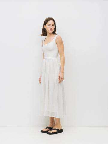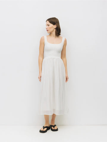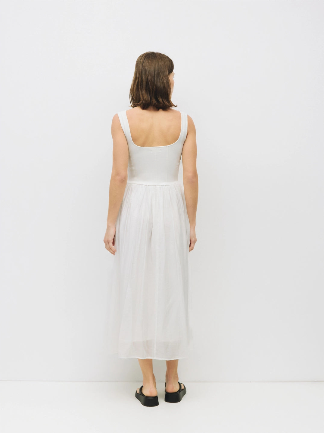 The Holland Dress combines a knitted corset-style top with a woven skirt for a sleek look. It features shirring at the waist and a fully lined skirt, offering both comfort and a polished appearance.