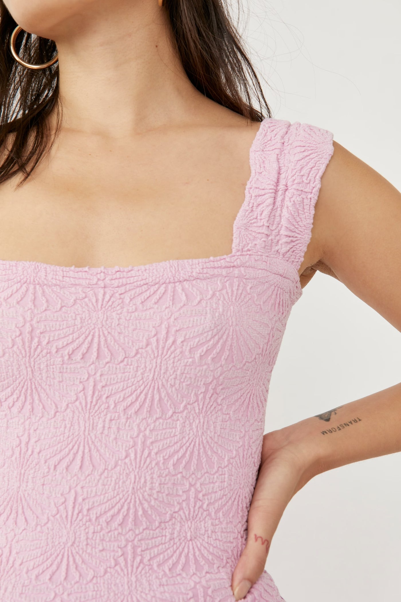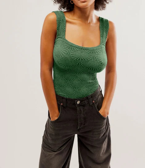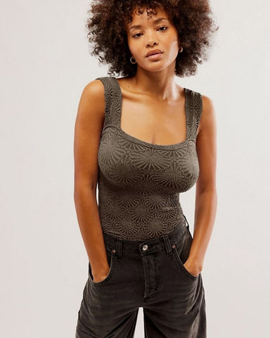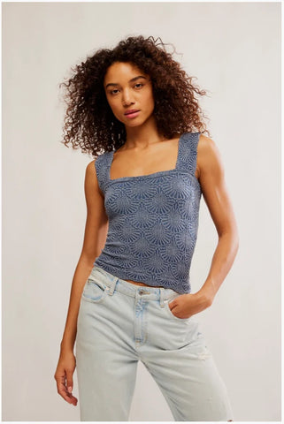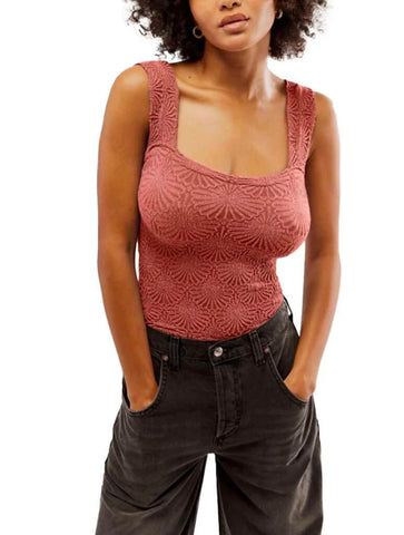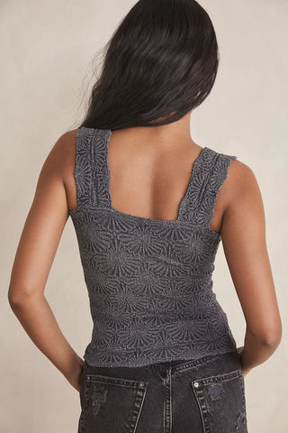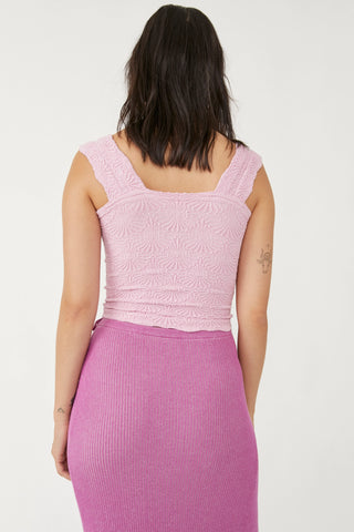 So sweet cami featured in a cropped, square-neck silhouette and jacquard floral design with statement lettuce-edge hemline.