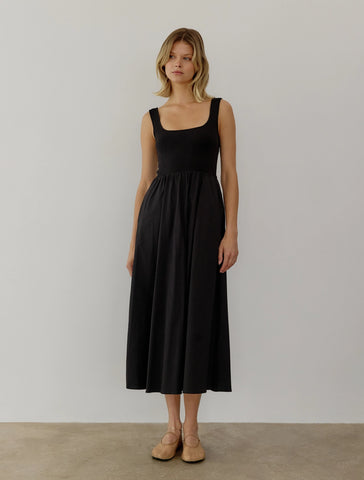 The Lucinda Dress is a maxi-length dress with a knit square neckline top and a woven full skirt. The different fabrics create visual interest in this classic silhouette. This style also includes hidden side pockets making it the ideal option for on-the-go styling.