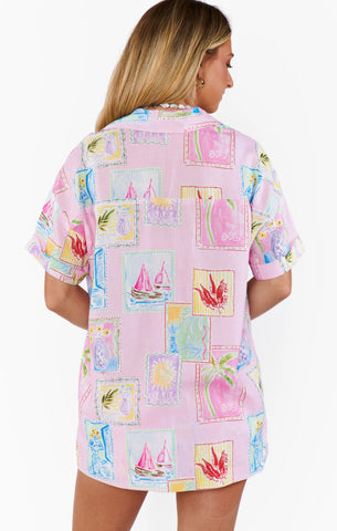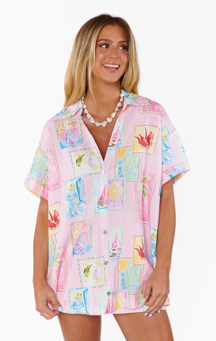 We can't wait to lounge around in the Parker Button Down! Linen fabric shapes this comfy shirt with an oversized fit, short sleeves and collared neckline. An effortless 'fit styled with the matching Bay Street Skirt and white sneakers.