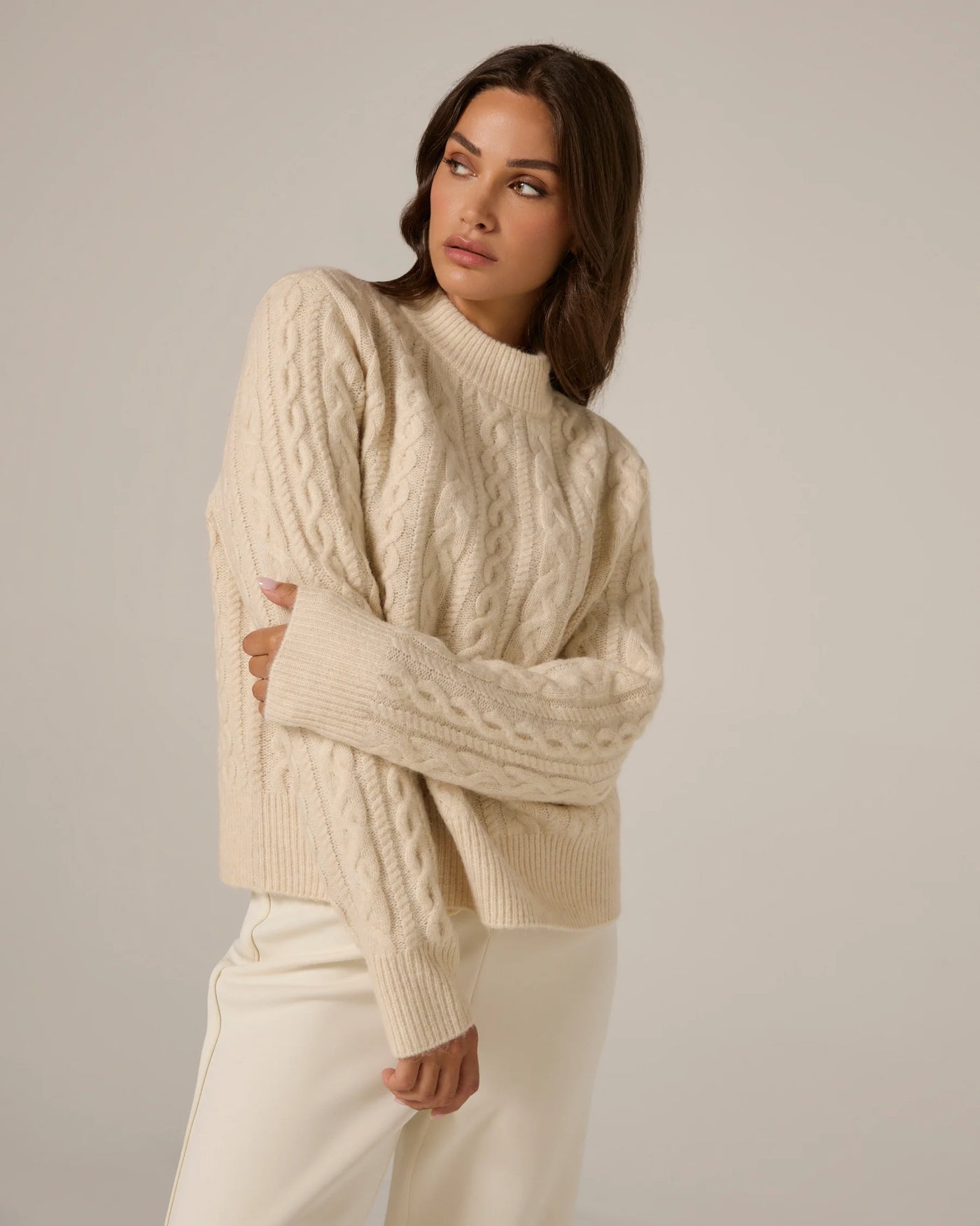 A timeless essential with elevated ease, the Riley Cable Knit Sweater is crafted from premium yarns for a soft, cozy feel. Its classic cable design and relaxed fit make it effortless to style—pair it with denim for everyday wear or dress it up for an evening out. Lightweight yet warm, it’s the perfect layer for the season. Fit: Relaxed