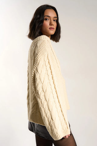 eaturing a chunky, oversized fit and exaggerated neckline, the Melanie Cable Knit Pullover is where comfort meets style.